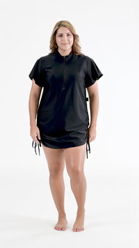 Designed with short ruffle sleeves, a high neckline, and a half-zip front, this dress lets you show off a colourful bather top underneath while staying protected from the sun. The drawstring sides allow you to adjust the length from a dress to a top, creating versatile styling for the beach, the pool, and beyond. The ruffle detail adds movement and charm, making this piece as effortless as a summer breeze.